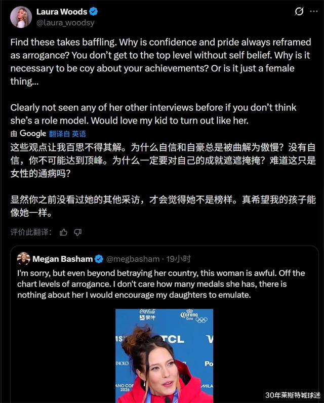 不过,TNT著名女主持Laura Woods却讲了公道话,她公开驳斥Megan Basham,“凭什么非要对自己的成就故作谦虚?”而且她认为谷爱凌很优秀,“我真希望自己的孩子将来能成为她那样的人!”按照Laura Woods的观点,之所以有人批评谷爱凌傲慢,是因为他们没看到过谷爱凌其他的采访。