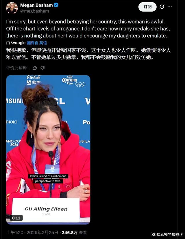 谷爱凌在冬奥会期间曾遭遇外媒的冷嘲热讽,当时她拿了两块银牌,有记者问她是拿了两银还是丢了两金时,谷爱凌表示这种说法十分荒谬。而对谷爱凌有偏见的美国记者Megan Basham在社媒上对此进行了炮轰,称谷爱凌背叛了美国,而且十分傲慢,即便拿了很多奖也不值得孩子去学习。