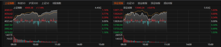 1月6日上午,A股四大指数早盘涨跌不一,沪指半日涨超1%再创10年新高。截至午间休市,沪指涨1.14%,深证成指涨0.81%,创业板指跌0.04%,科创综指涨1.05%。沪深北三市半日成交17961亿元,较上个交易日同期放量1472亿元。全市场超3600只个股上涨。