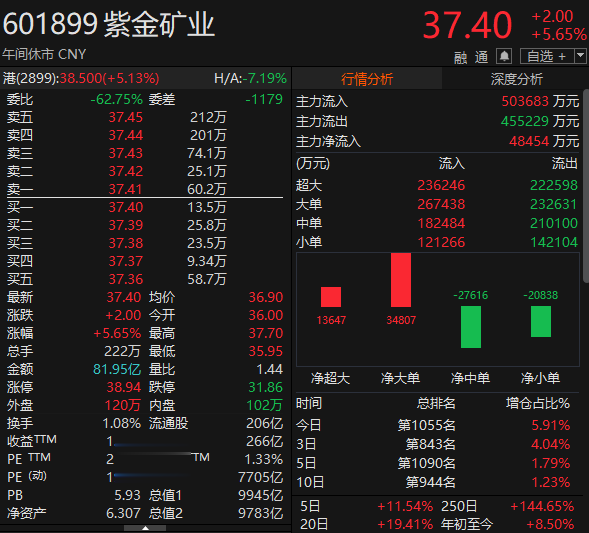 紫金矿业总市值一度突破1万亿元