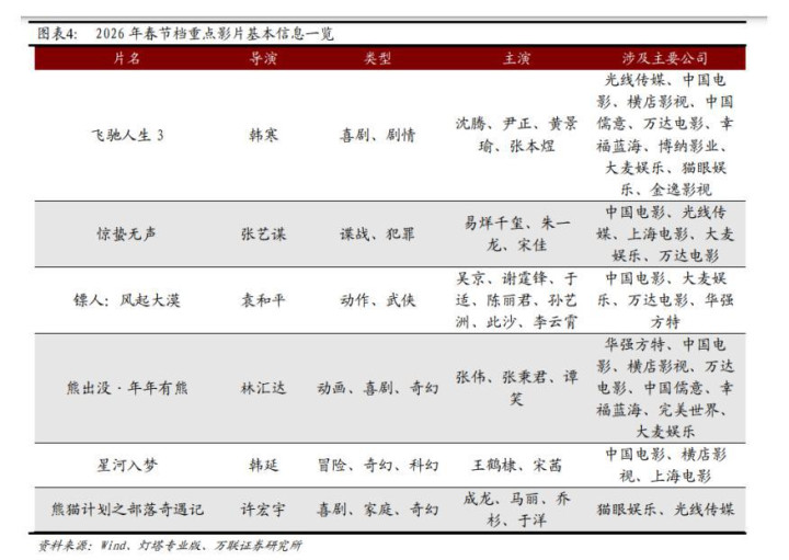据媒体报道,2026春节档背后涉及光线传媒、中国电影、横店影视、幸福蓝海、博纳影业、金逸影视、上海电影、万达电影、完美世界等多家上市公司。