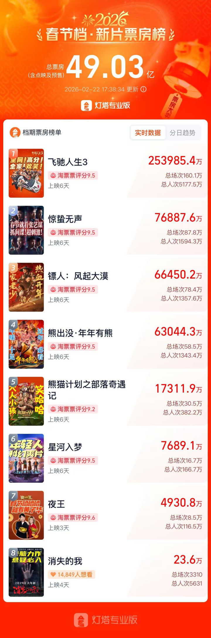 2月22日下午,记者浏览灯塔专业版,发现马年春节档共安排了8部影片,分别为《飞驰人生3》《惊蛰无声》《镖人:风起大漠》《熊出没·年年有熊》《熊猫计划之部落奇遇》《星河入梦》《夜王》和《消失的我》,截至发稿时,《飞驰人生3》共上映160.1万场次,票房收入突破25.39亿元,处于遥遥领先的位置,《惊蛰无声》的实时票房收入为7.69亿元,暂列第二。