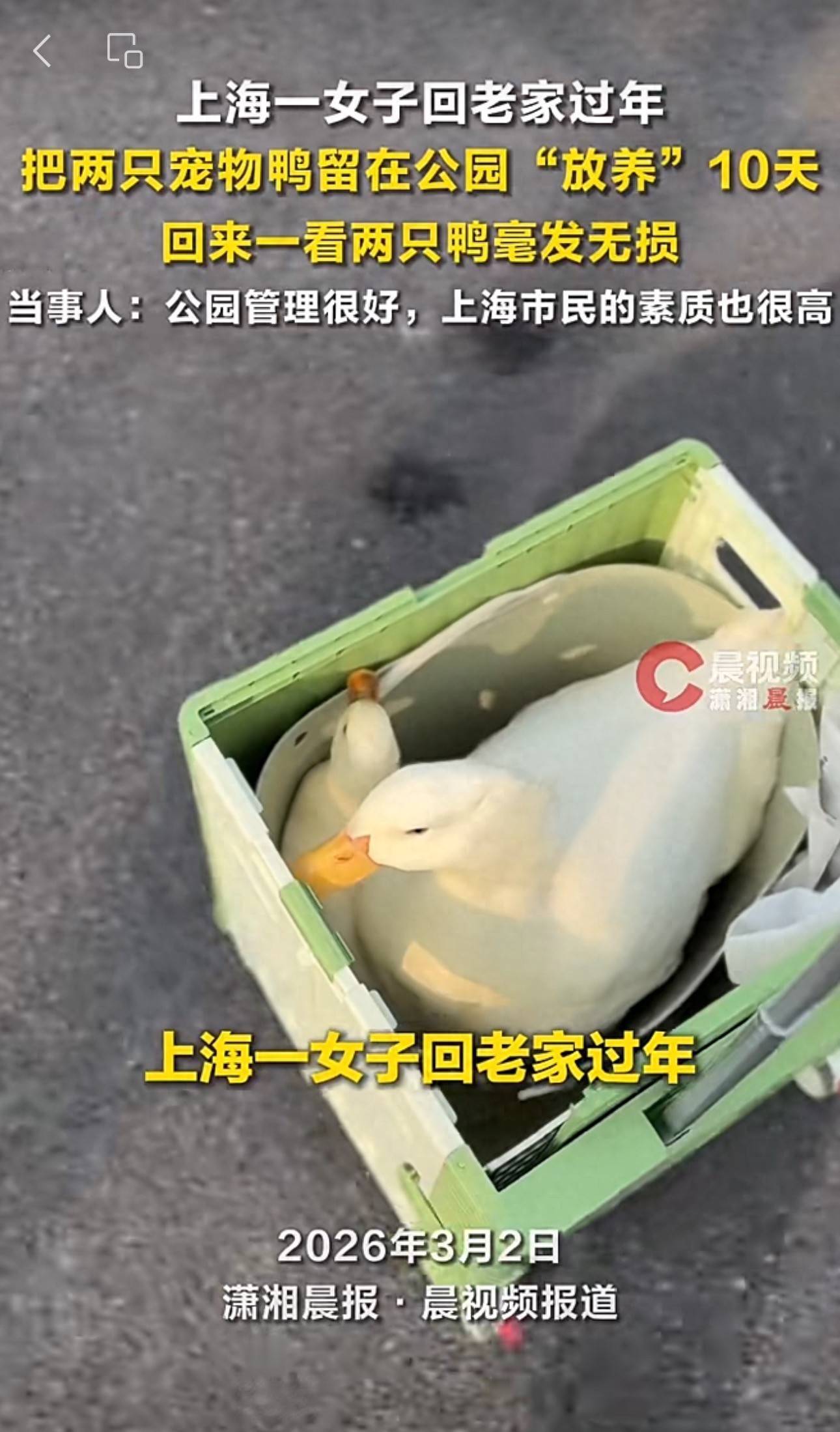 上海一女子回老家过年,把两只宠物鸭留在公园“放养”10天,回来一看两只鸭毫发无损,还在公园里悠哉游哉。