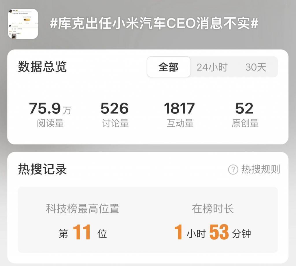 4 月 22 日,# 库克出任小米汽车 CEO 消息不实 # 的话题登上了微博热搜位置,引发广大网友的关注。