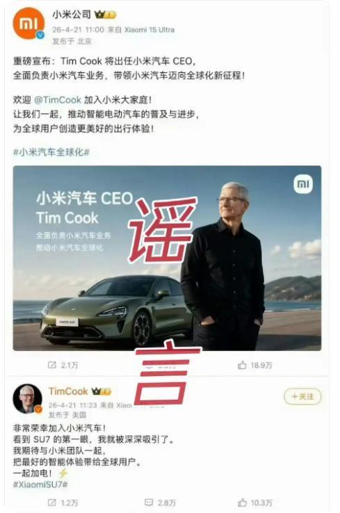 据了解,今日几张高仿 P 图关于苹果 CEO 蒂姆 · 库克将出任小米汽车 CEO 的图片在网络流传,这些网络图片甚至还伪造了蒂姆 · 库克的回应:" 非常荣幸加入小米汽车!" 这几张图片,瞬间引发网络热议。